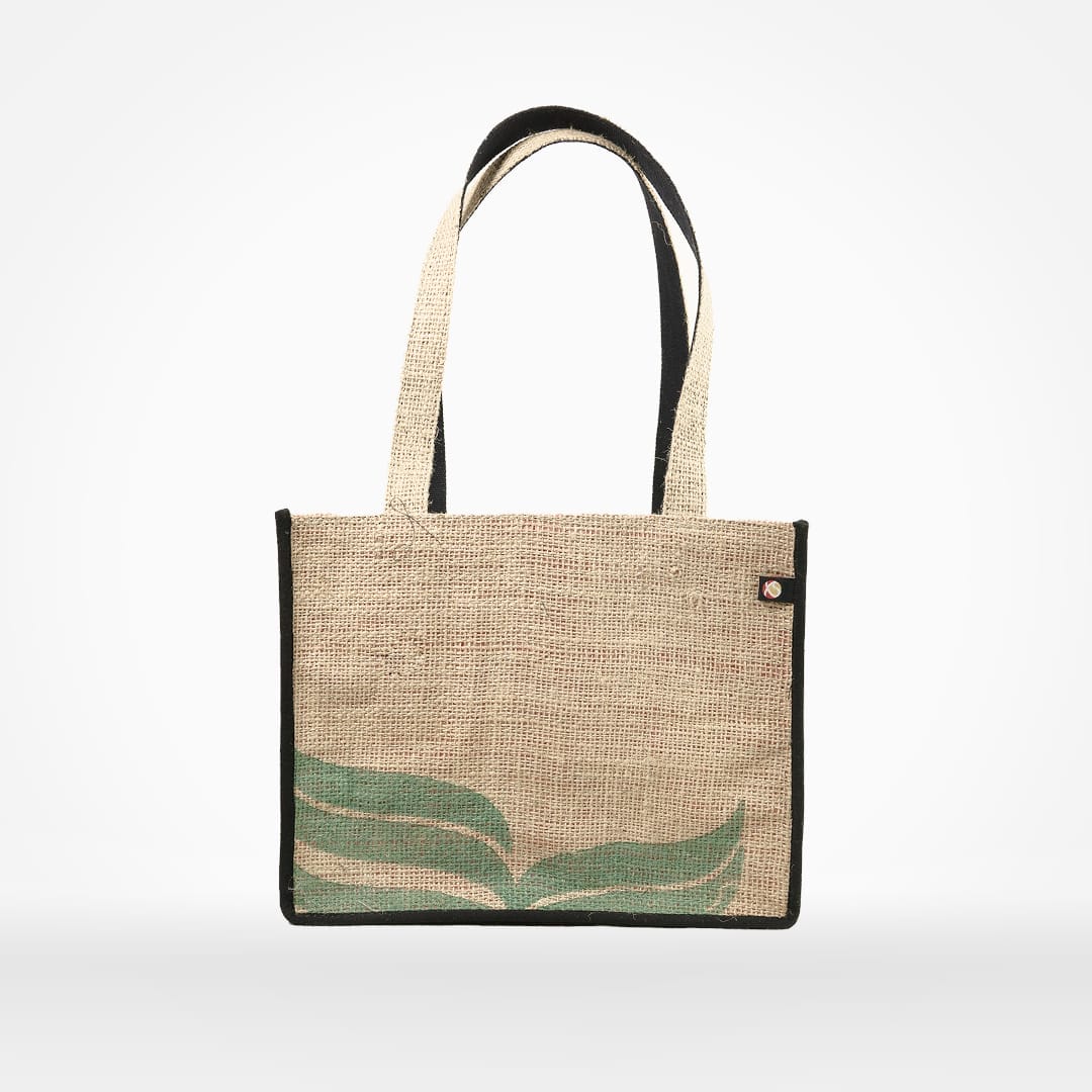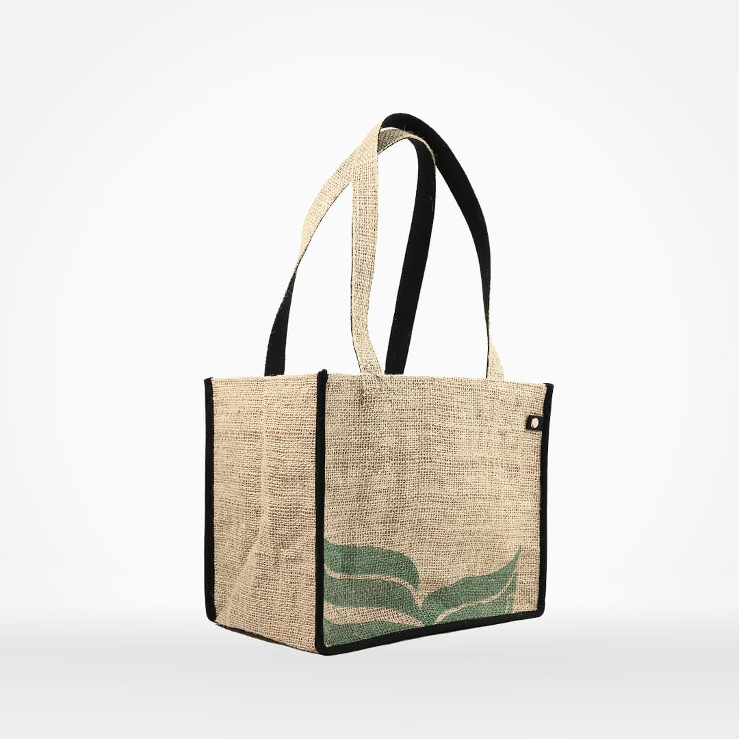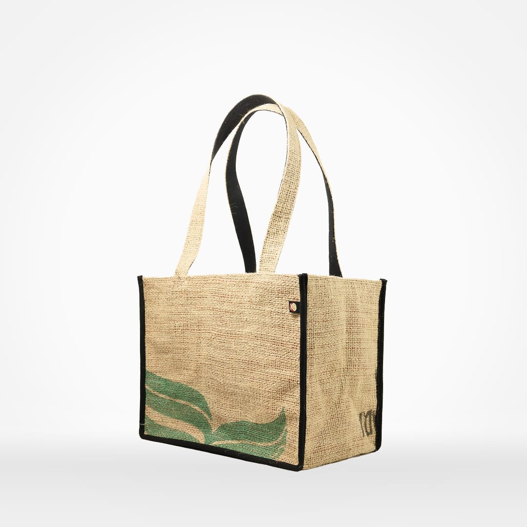 Made from hessian sack, an attractive and sustainable material. Comes with polyester handles.